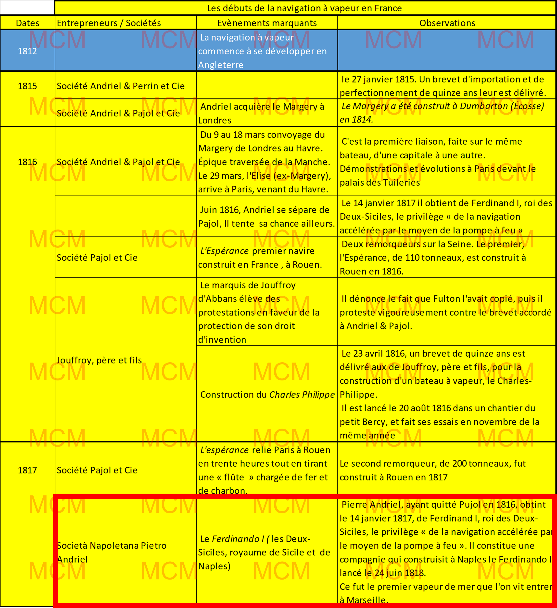 *) Le décret royal était conçu en ces termes : « Pietro Andriel, originaire de Montpellier, se voit accorder un privilège privé pour une durée de quinze ans pour la navigation accélérée au moyen de pompes à feu, dite navigation à vapeur, dans les eaux qui baignent la côte et les fleuves de notre royaume des Deux-Siciles, quel que soit le système de construction des mêmes pompes. »