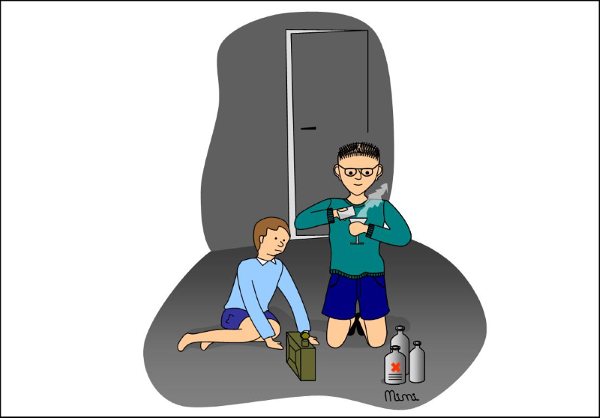 Un jour dans le « caveau* » attenant à la maison Marcel avait disposé des fioles pour une expérience chimique du plus grand intérêt. Mon père alerté par… notre silence parti à notre recherche et nous trouva absorbés par les manipulations.