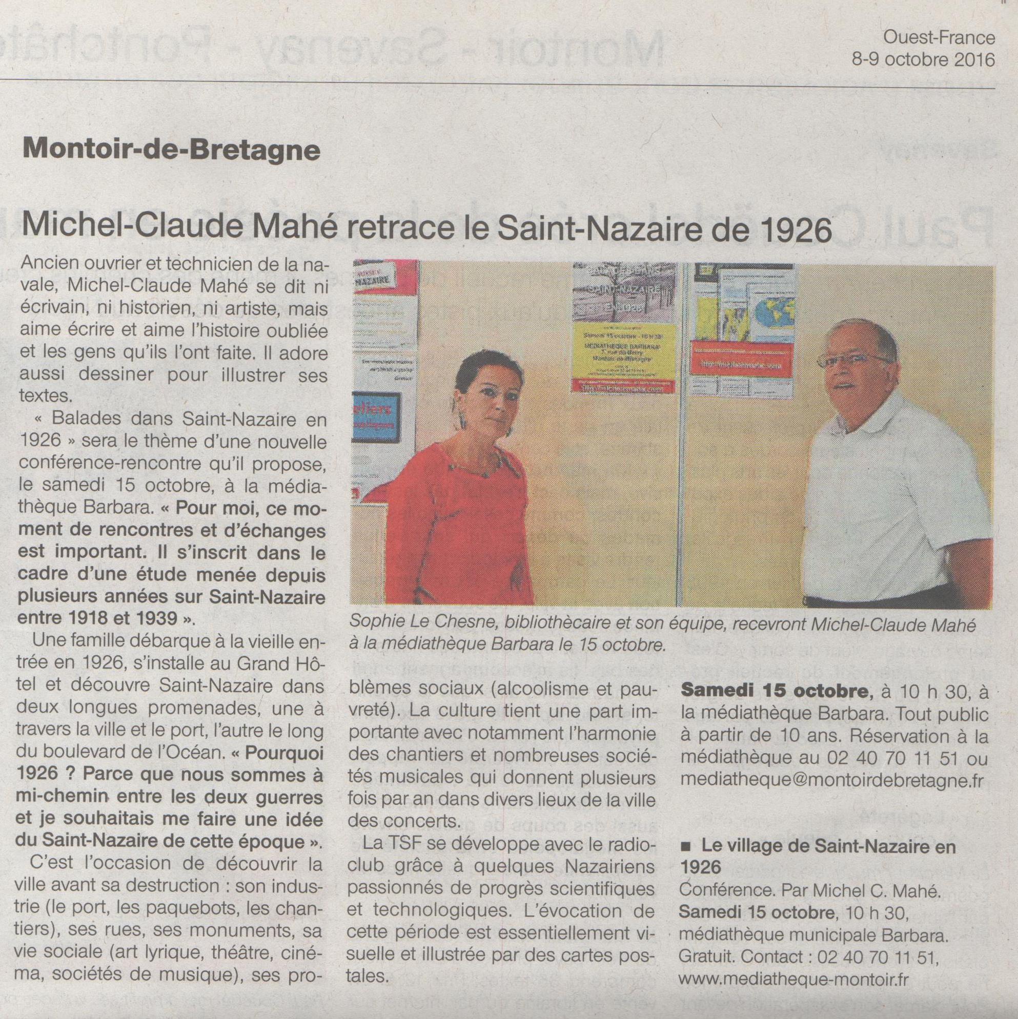 Pourquoi 1926, parce que nous sommes à mi-chemin entre les deux guerres et je souhaitais me faire une idée du Saint-Nazaire de cette époque. C’est une ville où la culture est importante avec ses théâtres, son cinéma, les expositions du Groupe artistique, ses nombreuses sociétés musicales qui donnent plusieurs fois par an, dans divers lieux de la ville, des concerts. C’est une ville industrielle, la réputation de ses chantiers de construction n’est plus à faire, le paquebot « Île-de-France construit par le Chantier de Penhoët a été lancé en mars et il est en cours d’achèvement, le même chantier s’est lancé dans la construction aéronautique avec l’hydravion Richard-Penhoët qui fait ses premiers essais au-dessus de la baie. Elle est le port d’attache des paquebots de la Compagnie Générale Transatlantique desservant le Mexique, les Antilles, le Venezuela, la Colombie et la Guyane Elle se veut aussi station balnéaire et utilise tous ses atouts pour se faire connaître telles les grandioses fêtes américaines pour l’inauguration du monument américain, boulevard de l’Océan qui ont déplacé une foule considérable. La TSF se développe avec le Radio-Club grâce à quelques Nazairiens passionnés de progrès scientifiques et technologiques. La ville se dote d’un ponton flottant pour l’accostage du bac de Mindin en lieu et place du vieil ascenseur pour les voitures.