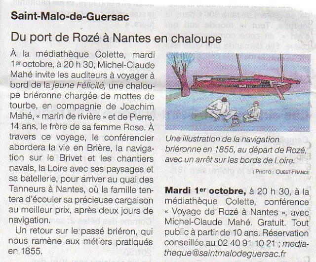 Conférences données : Musée de la Marine à Saint-Brevin-les-Pins – 4 et 18 juillet, 1er, 15 et 22 août 2018. Médiathèque Barbara – Montoir-de-Bretagne, 11 mai 2019. Association brevinoise de généalogie – 24 mai 2024 à Saint-Brevin-les-Pins.