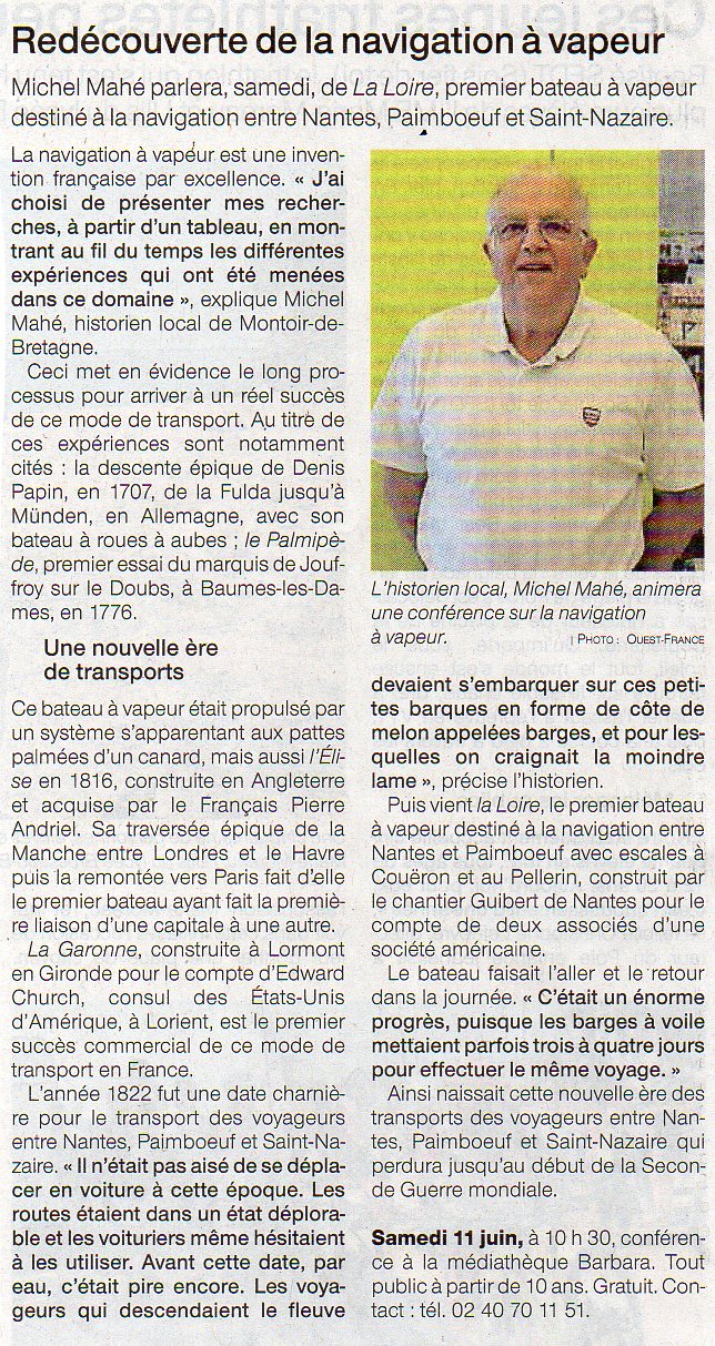 L’année 1822 fut une date charnière pour le transport des voyageurs entre Nantes, Paimbœuf et Saint-Nazaire. La chose n’était pas aisée pour vous y rendre en voiture par la route à cette époque, Elles étaient dans un état déplorable et les voituriers même hésitaient à les utiliser. Avant cette date, par eau, c’était pire encore. Les voyageurs qui descendaient le fleuve devaient s’embarquer « sur ces petites barques en forme de côte de melon, appelées barges, et pour lesquelles, vous craignez la moindre lame, la plus légère brise, rases qu’elles sont sur l’eau et couvertes d’une voile énorme qui ne semble nullement en rapport avec l’exiguïté de leurs dimensions. »