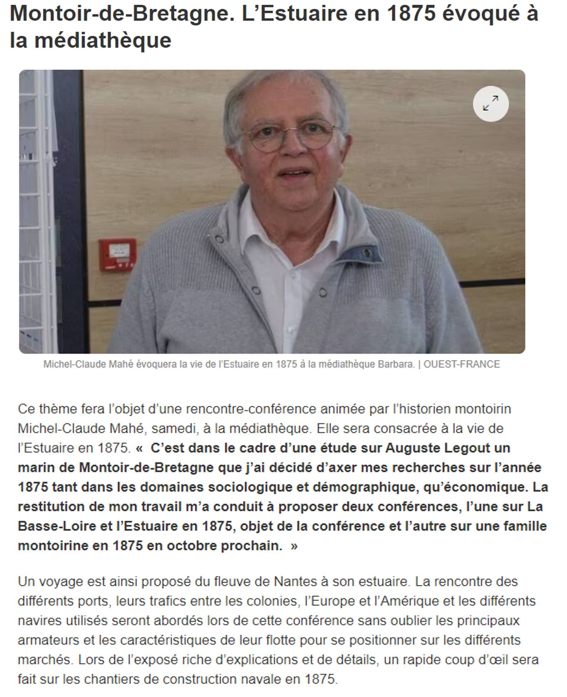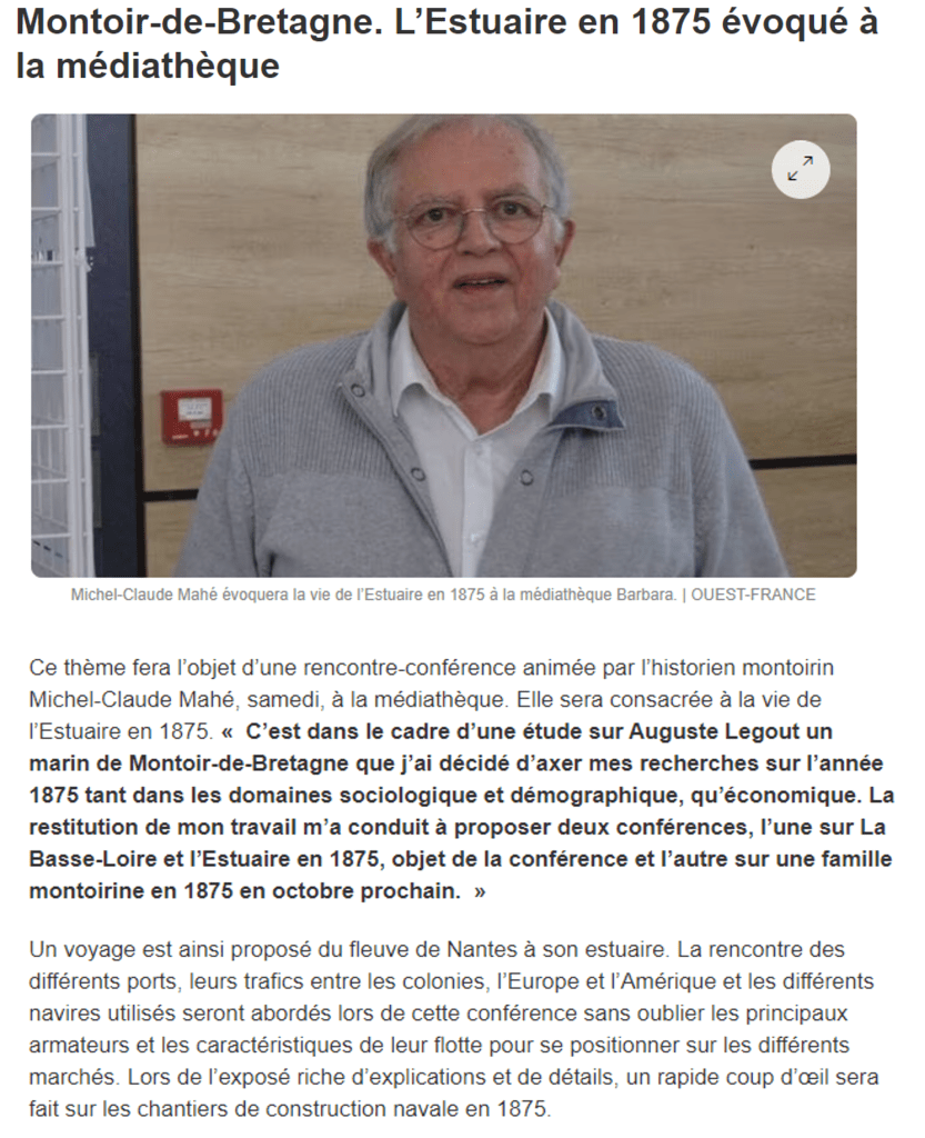 C’est dans le cadre d’une étude sur un marin de Montoir « Auguste Legout » et après avoir recueilli, analysé tous les documents le concernant, mis en forme l’article, prêt à être publié que j’ai pris conscience que je ne pouvais, tout au moins en suivant mon mode de fonctionnement, dissocier M. Legout du contexte dans lequel il vivait. Alors j’ai différé la publication et me suis attelé à résoudre ce problème à travers de nombreux articles sur mon blog concernant l’année 1875, tant sociologique et démographique (le mariage et le service militaire, la diminution de la natalité, la consommation d’alcool, la mortalité, la mortinatalité, le déclin des naissances) qu’économique (les ports, le commerce maritime en Basse-Loire, les navires, les armateurs). La restitution de ce travail se fera sur deux conférences : « La Basse- Loire et l’estuaire en 1875 », objet du présent exposé et « Une famille montoirine en 1875 » en octobre prochain.