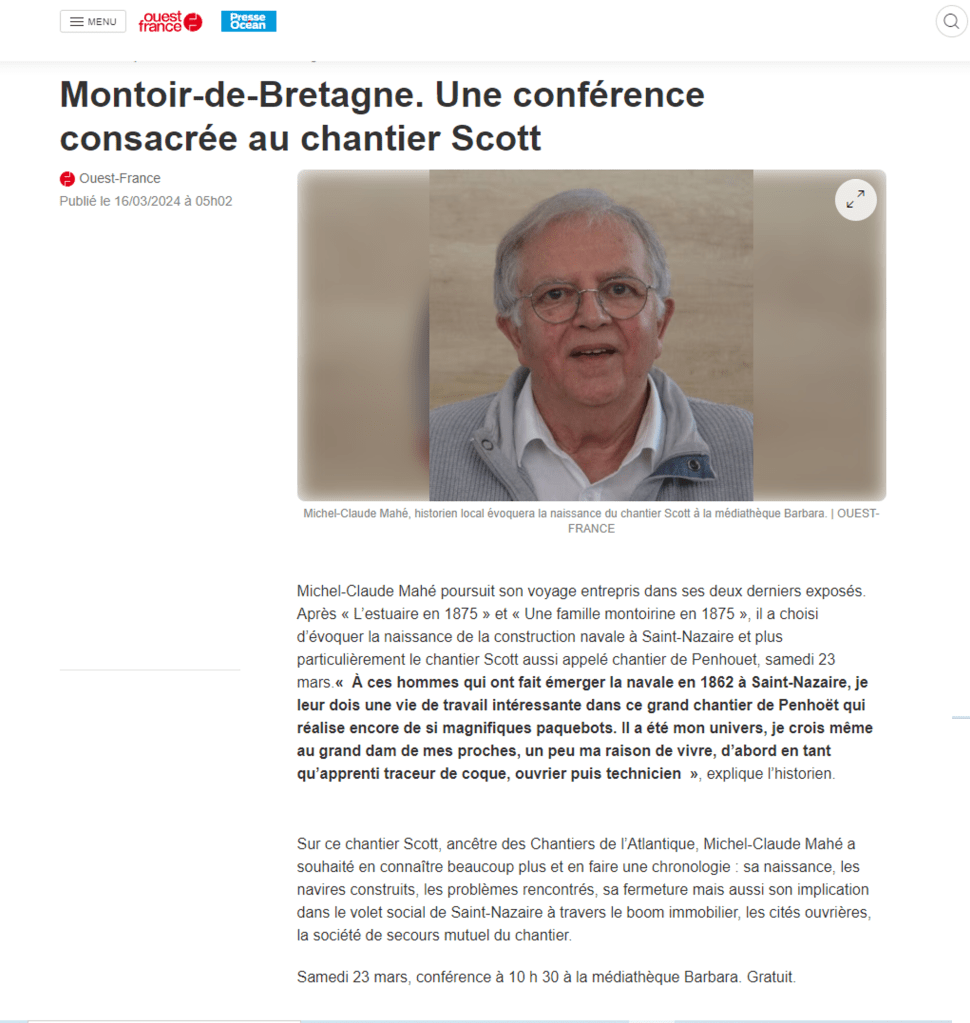 Je vous propose dans cette nouvelle conférence de continuer le voyage entrepris dans les deux derniers exposés : « L’estuaire en 1875 » et « Une famille montoirine en 1875 ». Dans la première, nous avons suivi le fleuve de Nantes à son estuaire, à la rencontre des différents ports, leurs trafics, les différents types de navires utilisés. Nous avons rencontré les principaux armateurs et des caractéristiques de leur flotte pour se positionner sur les différents marchés. Dans la seconde, nous avons rencontré Eugène 27 ans, et d’Anne-Marie 25 ans, tous les deux cultivateurs et habitant « au village, en Montoir », en Loire-Inférieure. Nous avons suivi toutes les étapes qui ont jalonné leur vie de couple. Nous en avons profité pour prendre une « photographie » de la vie des Montoirins de cette époque à travers les différents métiers exercés. C’était une évidence, en abordant l’industrie dans l’estuaire, il me fallait parler de la naissance de la construction navale à Saint-Nazaire. Au cours de ce travail, j’ai pris conscience que je dois beaucoup à tous ces hommes qui en 1862 ont fait émerger « la navale » à Saint-Nazaire. Je leur dois une vie de travail intéressante dans ce grand chantier de Penhouet qui réalise encore de si magnifiques paquebots. Il a été mon univers, je crois même, au grand dam de mes proches, un peu ma raison de vivre, d’abord en tant qu’apprenti traceur de coque, ouvrier puis technicien. Je ferme les yeux et par la pensée, j’endosse mon bourgeron et porte ma bahoule à l’épaule alors je me sens « eux » au pied des cales de construction de l’Impératrice-Eugénie, ou de la France ; je me sens « eux » dans les ateliers, cordeau en main, traçant une tôle ou au pointeau marquant une ligne de rivets ; je me sens « eux » lorsque l’œuvre une fois terminée, elle glisse lentement vers la mer, alors avec « eux », compagnons de fortune et d’infortune, je secoue ma casquette au-dessus de moi et je crie : Hourra ! Vous l’avez compris, nous allons nous intéresser au chantier Scott aussi appelé chantier de Penhouet, ancêtre des Chantiers de l’Atlantique. Souvent, dans les documents, hormis les publications de revues d’histoire faites par les historiens locaux, il est souvent décrit en cinq ou six lignes. Vous me connaissez, je suis curieux et je souhaitais en connaître beaucoup plus, en faire une chronologie : sa naissance, les navires construits, les problèmes rencontrés, sa fermeture mais aussi son implication dans le volet social de Saint-Nazaire à travers le boom immobilier, les cités ouvrières, la société de secours mutuels du chantier…