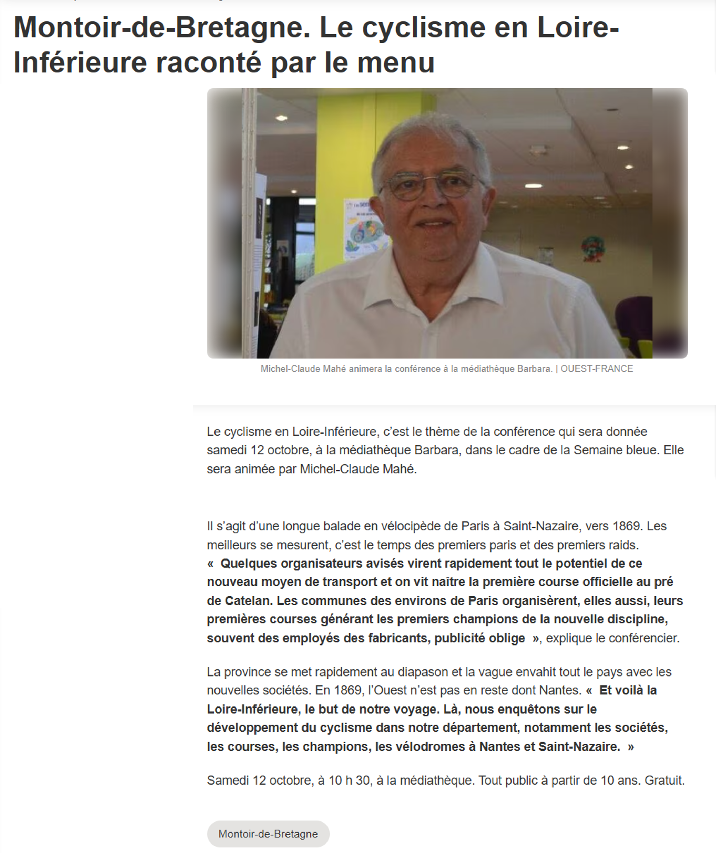 Je vous invite, dans cette conférence, à une longue balade en vélocipède de Paris à Saint-Nazaire accompagné des premiers velocemen et women qui sillonnaient, entre autres, le bois de Boulogne entraînés par la mode du vélocipède vers 1869. Les meilleurs se mesurèrent, c’était le temps des premiers paris et des premiers raids. Quelques organisateurs avisés virent rapidement tout le potentiel de ce nouveau moyen de transport et on vit naître la première course officielle au pré Catelan. Cette nouveauté plut énormément et les communes des environs de Paris organisèrent, elles aussi, leurs premières courses, générant les premiers champions de la nouvelle discipline, souvent des employés des fabricants, publicité oblige. La province se mit rapidement au diapason, Toulouse, Bordeaux, Carcassonne et la vague envahit tout le pays avec les nouvelles sociétés (les associations de l’époque), les journaux spécialisés. En 1869, l’Ouest ne fut pas en reste, Angers, Brest, Rennes, Laval, Vannes, Nozay, Nantes en 1870… Tiens ! nous voilà en Loire-Inférieure, ce sera notre dernière grande étape, le but de notre voyage. Là, nous enquêterons sur le développement du cyclisme dans notre département, notamment les sociétés, les courses, les champions, les vélodromes à Nantes et Saint-Nazaire… Voilà un programme bien rempli. Cette étude a été menée, il y a quelques années, sous la forme d’articles et c’est avec plaisir que je l’ai compilée pour créer ce voyage dans le cadre de la Semaine bleue organisée par le CCAS de Montoir-de-Bretagne. La tradition est respectée, je présente toujours une nouvelle conférence à la Médiathèque Barbara que je remercie, car elle a su, dès le début et dans le temps, croire en mon projet. C’est un moment privilégié de rencontre et de partage. Je peux, de visu, répondre aux questions et les discussions sont toujours riches d’enseignements.