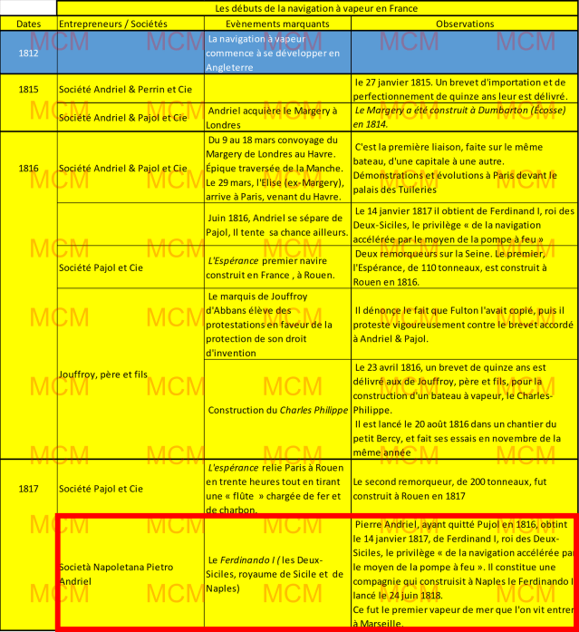 *) Le décret royal était conçu en ces termes : « Pietro Andriel, originaire de Montpellier, se voit accorder un privilège privé pour une durée de quinze ans pour la navigation accélérée au moyen de pompes à feu, dite navigation à vapeur, dans les eaux qui baignent la côte et les fleuves de notre royaume des Deux-Siciles, quel que soit le système de construction des mêmes pompes. »